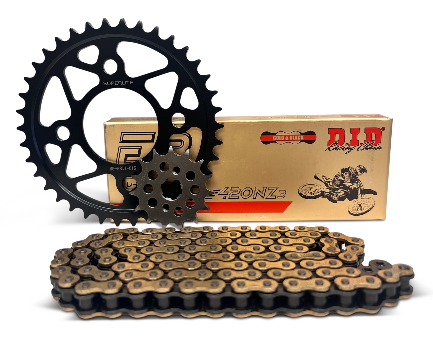 Superlite RSX Series sprocket kits shave unsprung "rotating" weight which in turn provides better acceleration, braking and handling. All kits include high quality RSX Series sprockets with multiple gear ratio options and high strength D.I.D. chains cut to length. These championship winning sprocket kits are extremely strong and built to last!